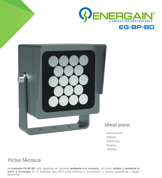 La luminaria EG-BP-BD esta diseñada en aluminio resistente a la corrosión, así como sellada y resistente al polvo y humedad, Es un bañador tipo SPOT para enfocar su iluminación a puntos específicos y largas distancias.