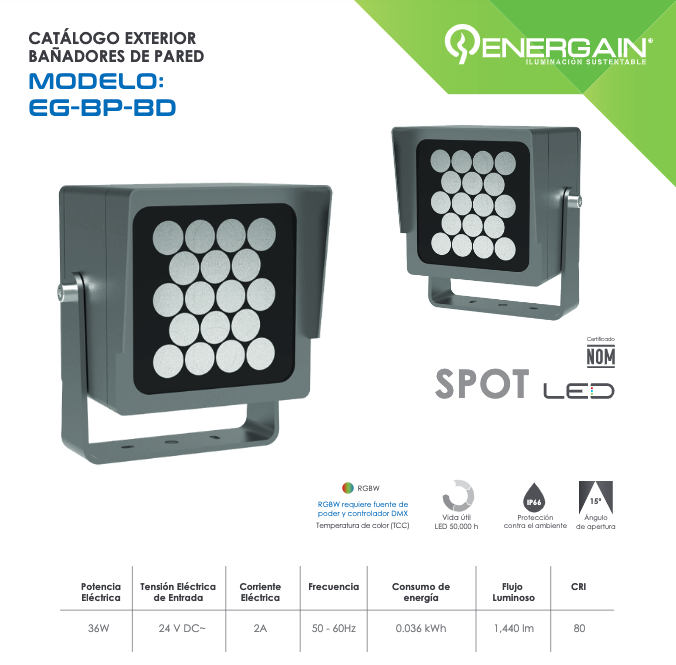 La luminaria EG-BP-BD esta diseñada en aluminio resistente a la corrosión, así como sellada y resistente al polvo y humedad, Es un bañador tipo SPOT para enfocar su iluminación a puntos específicos y largas distancias.