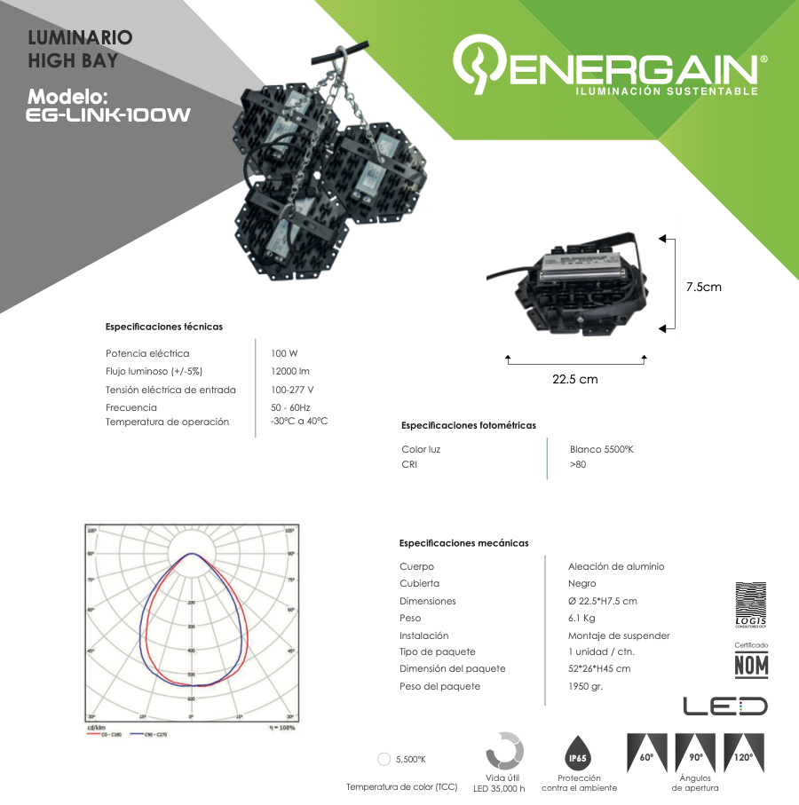 La EG-LINK-100W es una luminaria para suspender o sobreponer con libertad de ángulo de 85o .